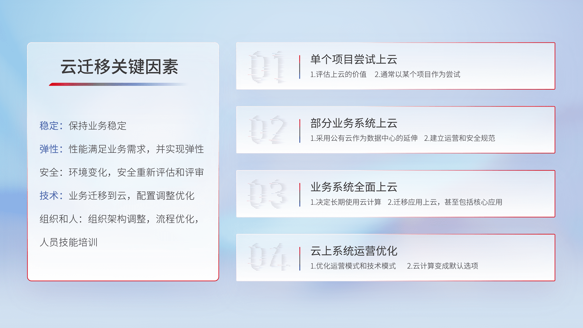 结合实际业务,,从规划设计、、、云平台选型、、云原生改造、、数据迁移、、、、集成交付,,,,迁移全过程为客户识别最佳上云路径,,,做好风险识别管理,,设计网络架构、、、、身份权限、、、、安全审计合规、、操作审计、、、、日志审计、、、、监控告警策略、、多站点容灾设计等,,,,对云上基础设施进行整体规划,,提升IT治理水平,,以满足弹性、、高可用、、、、高性能的需求。。。