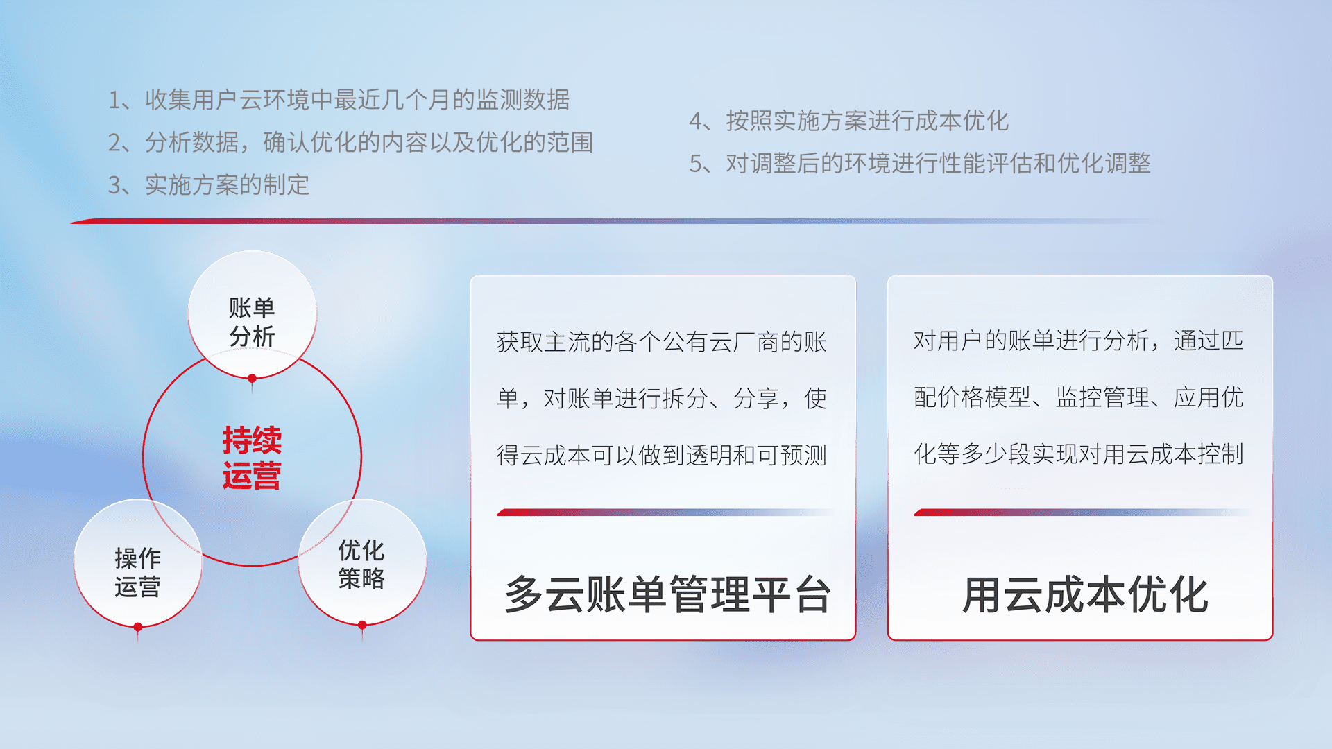通过多云纳管,,,以统一的资源数据模型把客户的云资源进行抽象和封装,,,,进而实现对多云资源的统一操作,,,,保障云资源管理的可靠性、、稳定性与可用性。。量身定制化运维内容,,,,配置、、、、开发运维、、、、补丁管理、、备份、、、监控、、、认证和访问管理、、审计和日常巡检等,,,,保障在用云过程中的可靠度,,,稳定度以及高可用率。。。。